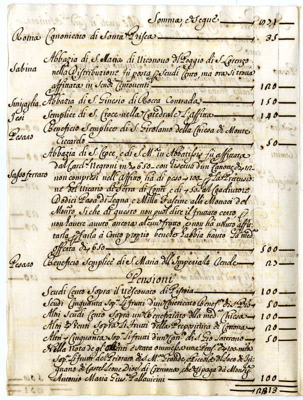 Nota de beneficii, e pensioni, delle quali il Cardinale Olivieri è stato provvisto dalla Santità di Nostro Signore nel corso del suo Pontificato (1715-1721)