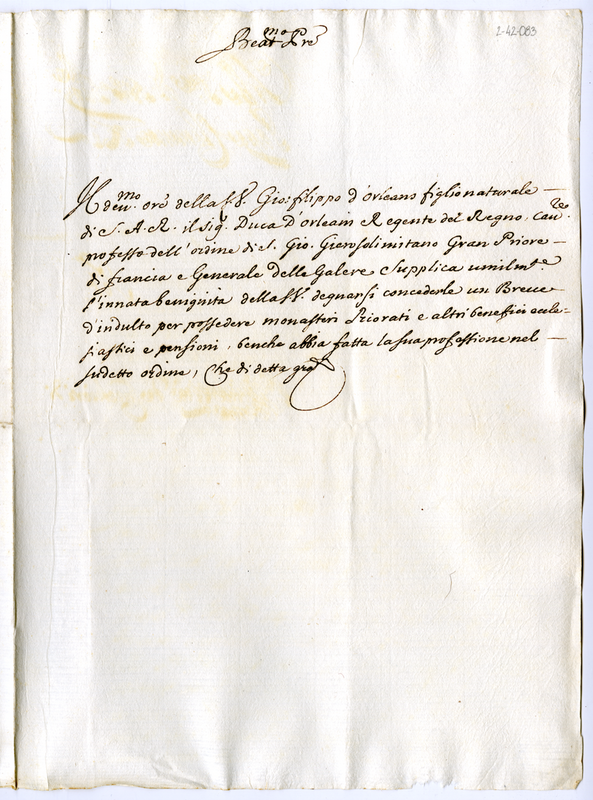 Lettera di Giovanni Filippo d'Orleans a papa Clemente XI (1700-1721)