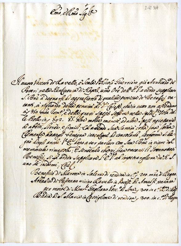 Lettera di Nicolò Guerriero vescovo di Scala e Ravello al cardinale prodatario (1700-1721)