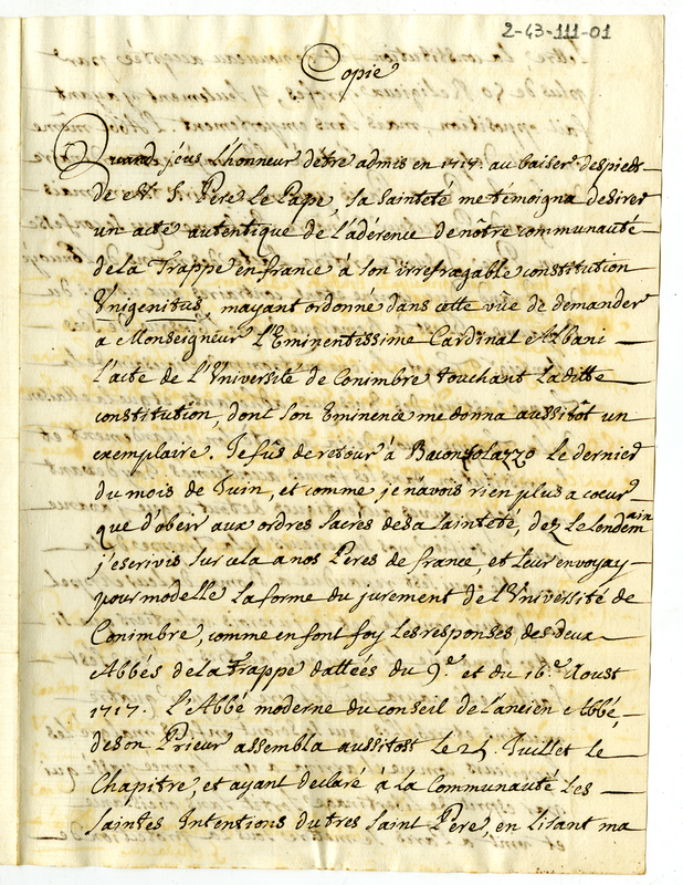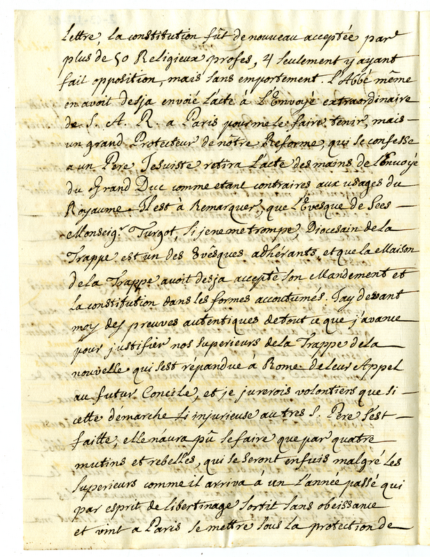 Informa di aver mandato un esemplare alla comunità della Trappa in Francia per il giuramento voluto dal papa alla costituzione unigenitus