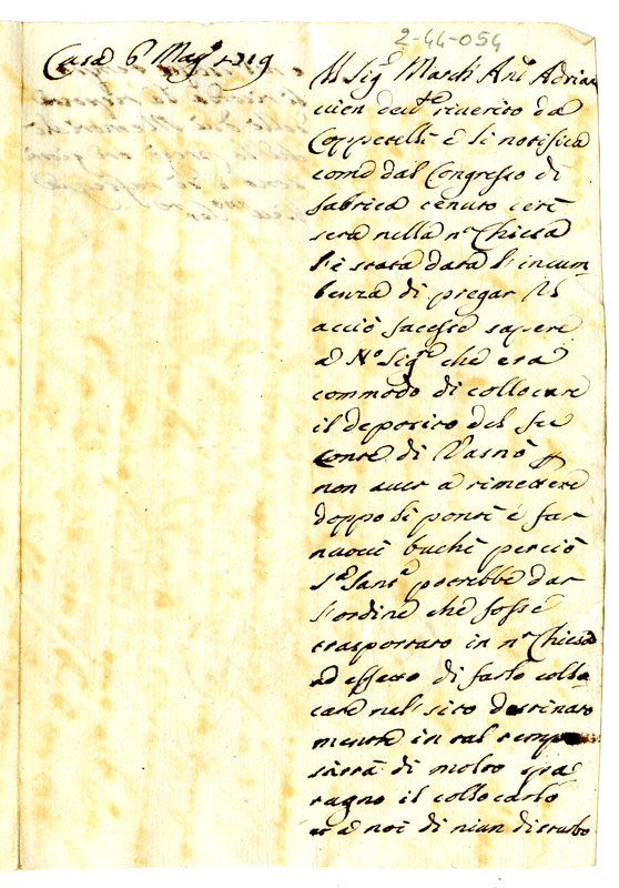 Si notifica al marchese l'incombenza avuta dal congresso di Fabrica affinchè il marchese faccia sapere al pontefice l'opportunità di collocare il deposito del conte di Vasnò nella chiesa dello scrivente