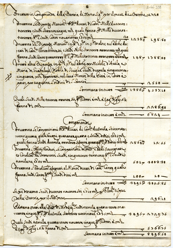 Fruttato in Componenda della Dateria di Nostro Signore per il mese di Ottobre 1720