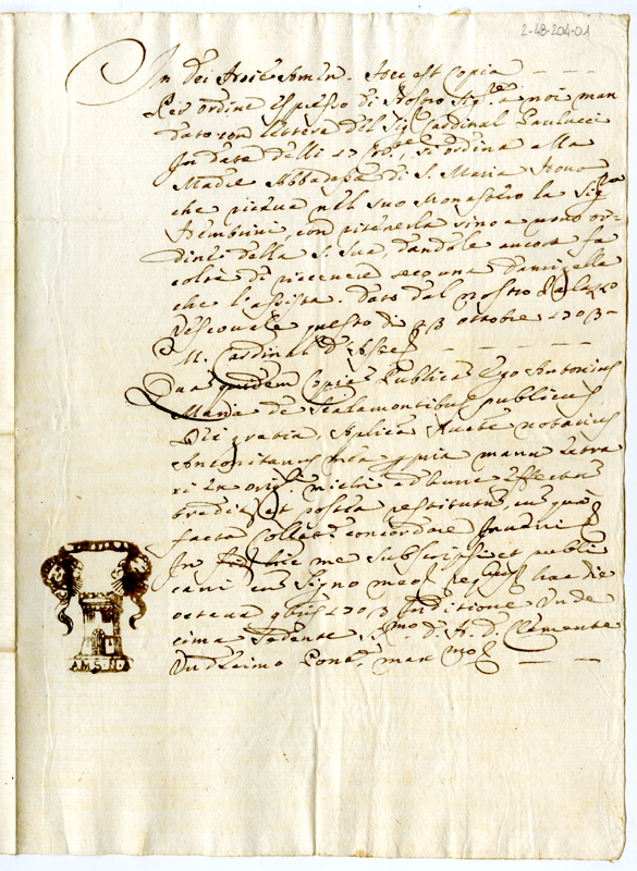Copia dell'ordine inviato dal cardinale Paolucci alla madre abbadessa del monastero di Santa Maria Nuova di Ancona di ricevere la signora Nembrini e di ritenerla fino a nuovo ordine del pontefice (1703 ottobre 23)