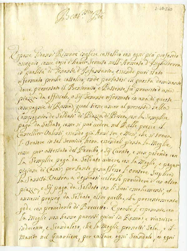 Lettera di Gioanni Rimare inglese cattolico a papa Clemente XI (1700-1721)
