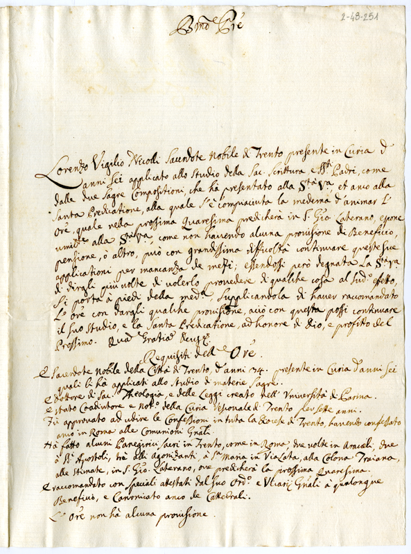 Lettera di Lorenzo Vigilio Nicolli sacerdote nobile di Trento a papa Clemente XI (1700-1721)