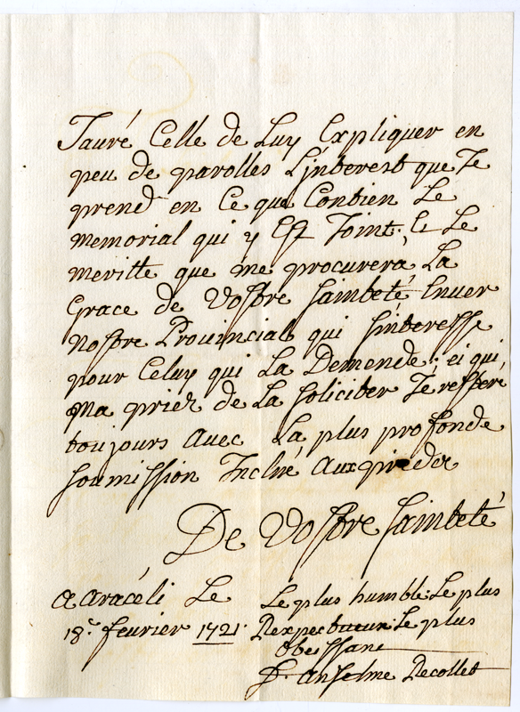 Lettera di Anselmo Recollet a papa Clemente XI (1721 febbraio 18)