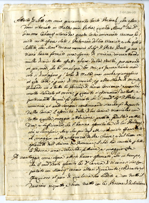 Attestato di Pietro Paolo Vincella in favore di don Pietro Berti (1718 giugno 17)