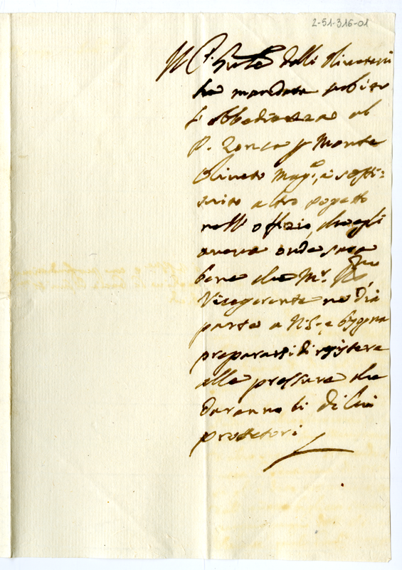 Biglietto del cardinale Spinola al vicegerente sullo spostamento di padre Zonca olivetano ad altro monastero (1711)
