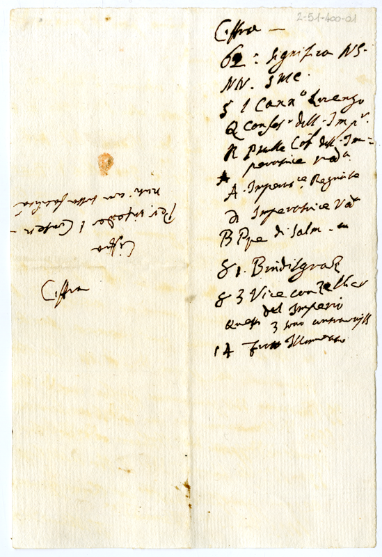 Biglietto con la definizione di alcune cifre inviato da fra Illuminato a papa Clemente XI (1700-1721)