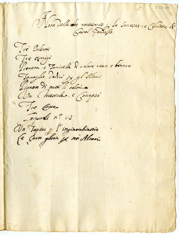 Nota delle robe necassarie per la sacrestia e chiesa di Castel Gandolfo (1700-1721)