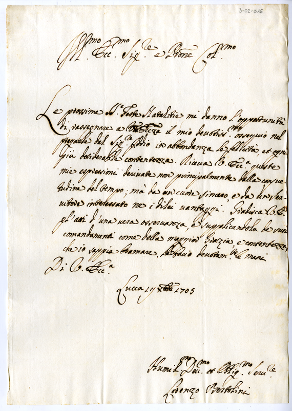 Lettera di Lorenzo Bertolini ad Annibale Albani (1705 dicembre 19)