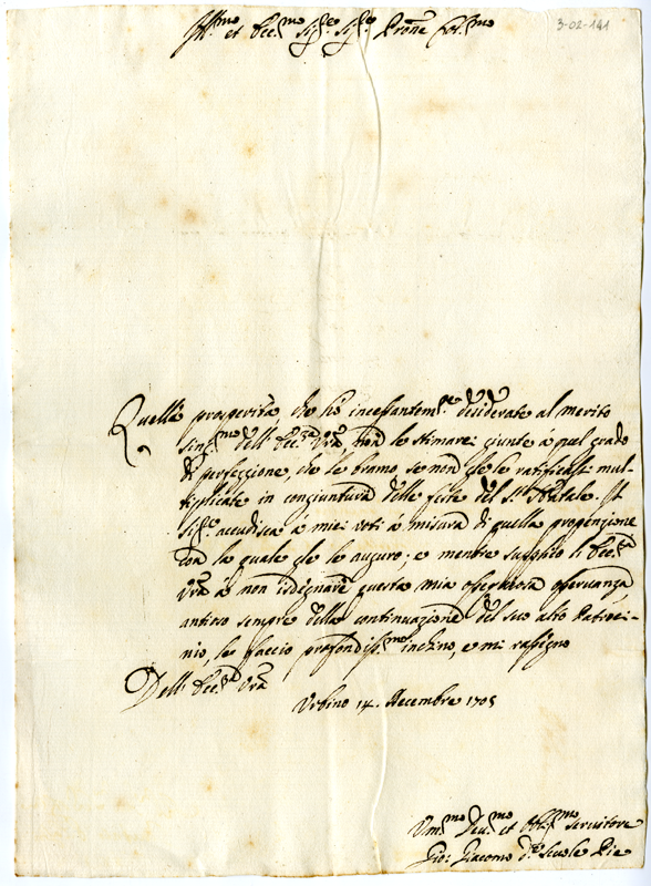 Lettera di Giovanni Giacomo delle Scuole Pie ad Annibale Albani (1705 dicembre 14)