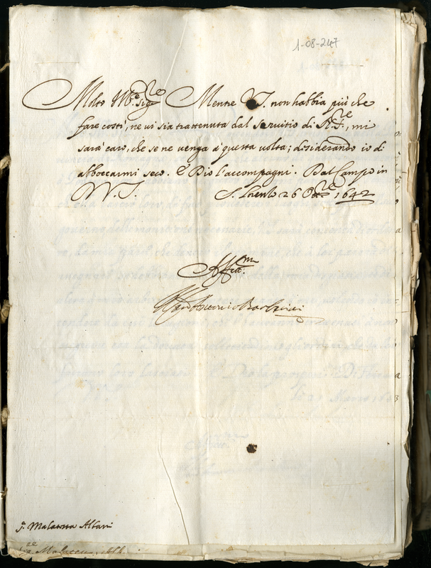 Lettera del cardinale Barberini Antonio senior a Malatesta Albani (1642 ottobre 26)