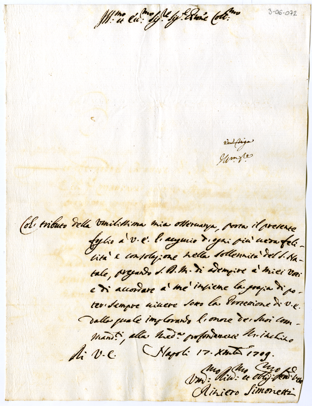 Lettera di Raniero Simonetti ad Annibale Albani (1709 dicembre 17)