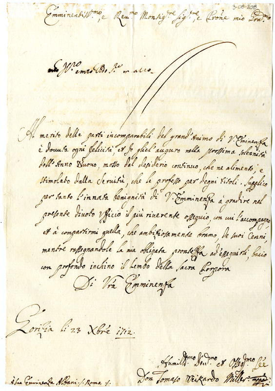 Lettera di don Tomaso Weikardo Miller al cardinale Annibale Albani (1712 dicembre 23)