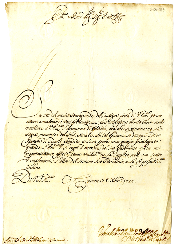 Lettera di Carlo Ottaviano vescovo di Cremona al cardinale Annibale Albani (1712 dicembre 8)