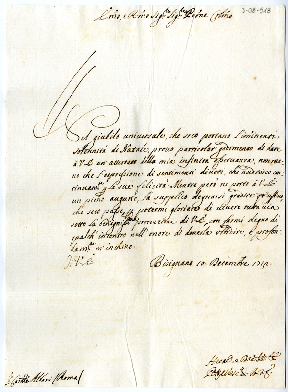 Lettera di Pompilio vescovo di Bisignano al cardinale Annibale Albani (1712 dicembre 10)