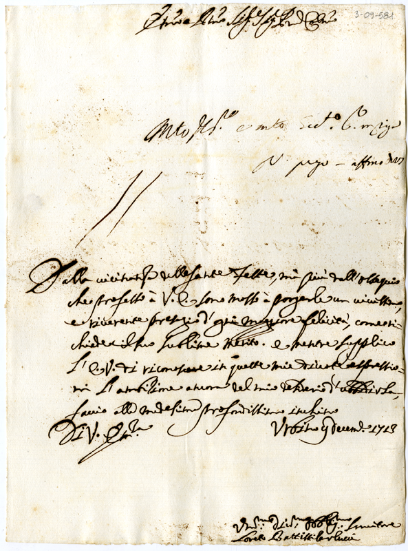 Lettera di Loreto Battisti Carlucci al cardinale Annibale Albani (1713 dicembre 9)