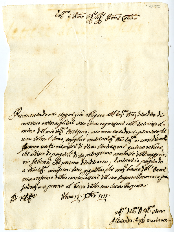 Lettera di Alessandro Marinucci al cardinale Annibale Albani (1715 dicembre 13)