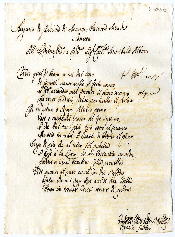 Augurio di felicità di Acanzio Pastore Arcade Sonetto All'Eminentissimo e Reverendissimo Signore Cardinale Annibale Albani