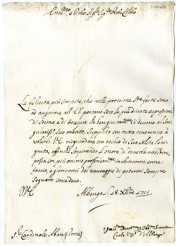 Lettera di Carlo vescovo di Albenga al cardinale Annibale Albani (1715 dicembre 18)