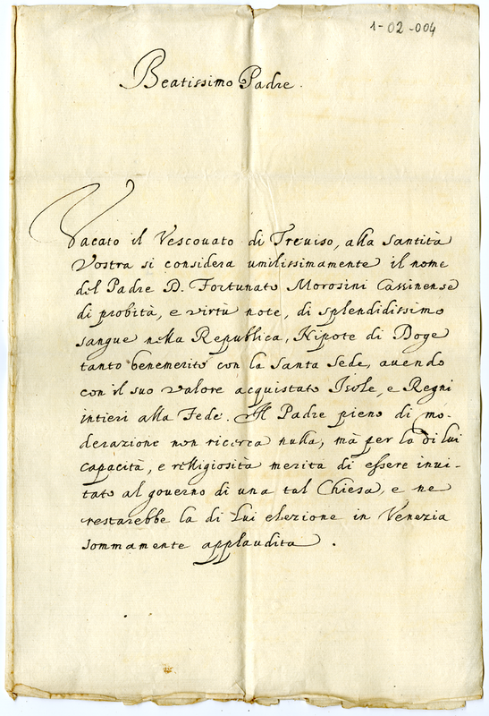 Proposta di elezione del padre don Fortunato Morosini nipote del doge Morosini, a vescovo di Treviso.
