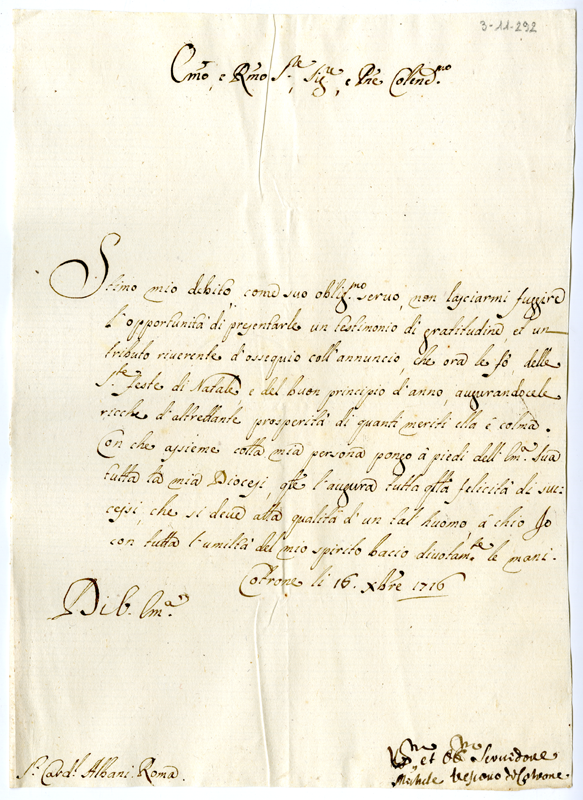 Lettera di Michele vescovo di Crotone al cardinale Annibale Albani (1716 dicembre 16)