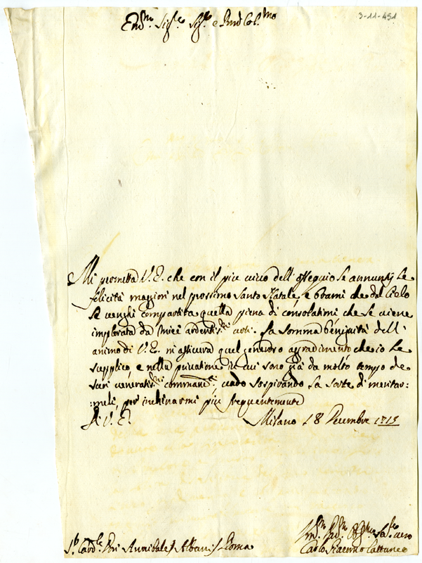 Lettera di Carlo Giacomo Cattaneo al cardinale Annibale Albani (1715 dicembre 18)