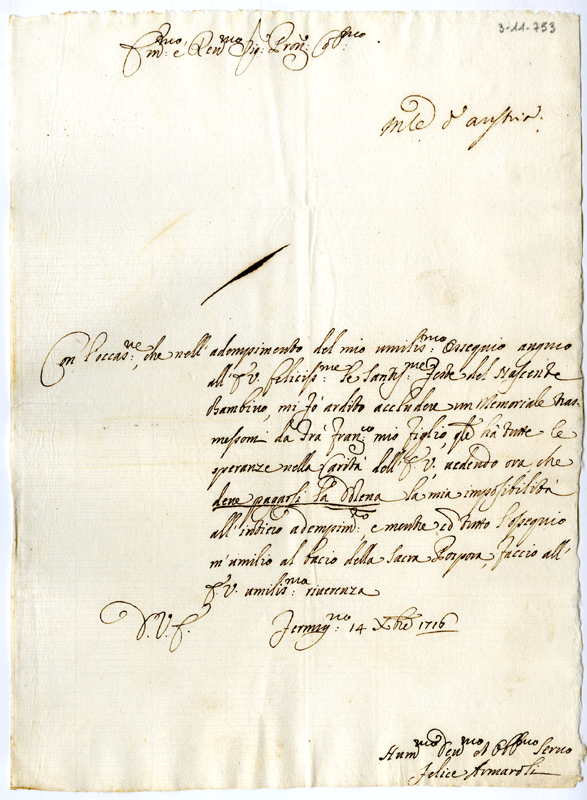 Lettera di Felice Armaroli al cardinale Annibale Albani (1716 dicembre 14)