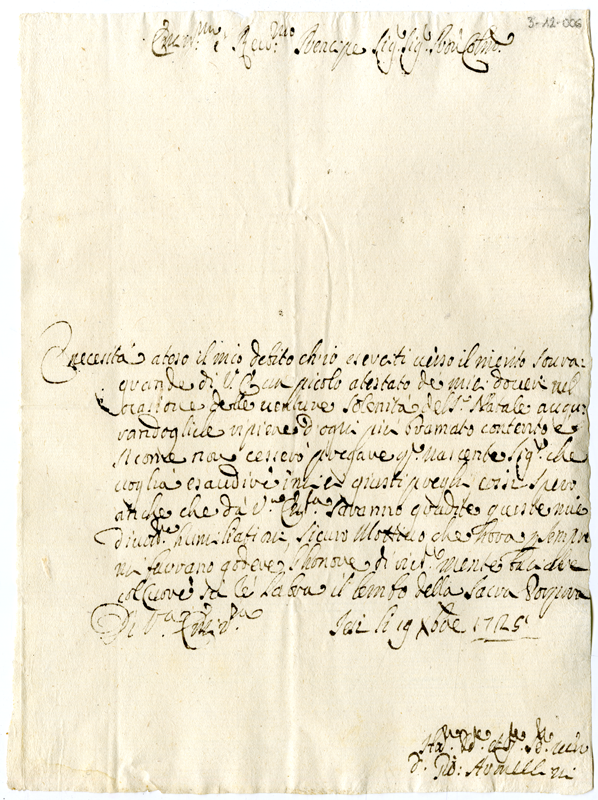 Lettera di Giovanni Armellini al cardinale Annibale Albani (1725 dicembre 19)