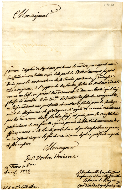 Lettera del barone di Hagen consulente di stato del re di Polonia al cardinale Annibale Albani (1725 dicembre 6)