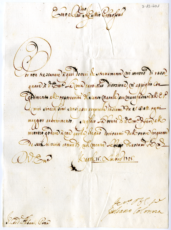 Lettera di Giuliano Colonna al cardinale Annibale Albani (1725 dicembre 15)