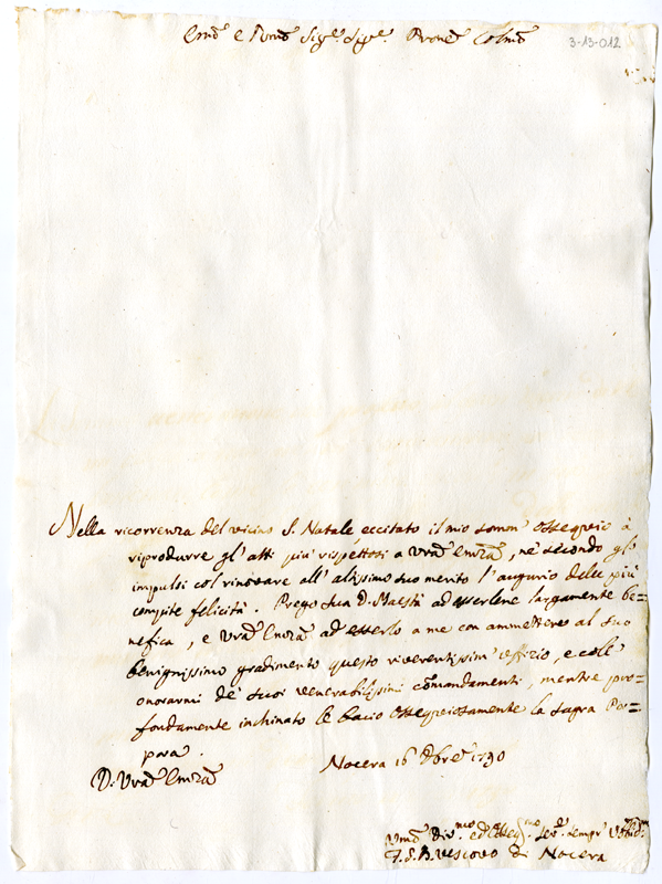 Lettera di Giovanni Battista vescovo di Nocera al cardinale Annibale Albani (1730 dicembre 16)