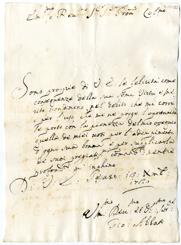 Lettera di Giovanni Abbati al cardinale Annibale Albani (1730 dicembre 13)