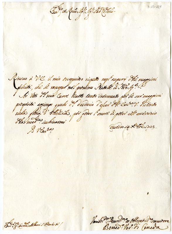 Lettera di Benedetto vescovo di Ceneda al cardinale Annibale Albani (1730 dicembre 14)