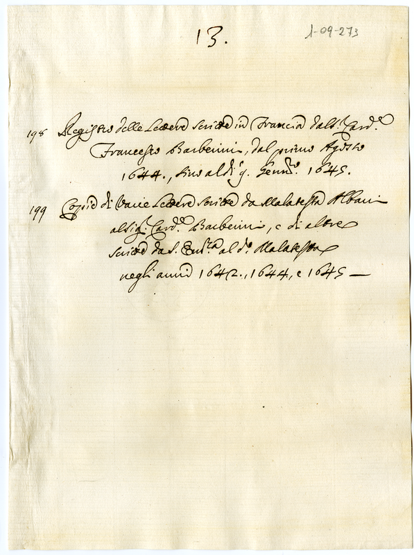 Copie di varie lettere scritte da Malatesta Albani al Signor Cardinale Barberini, o di altre scritte da Sua Eminenza al detto Malatesta negli anni 1642, 1644, e 1645.