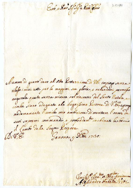 Lettera di Alessandro Antaldi Viti al cardinale Annibale Albani (1730 dicembre 9)
