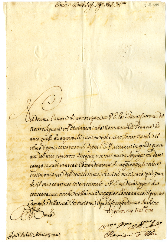 Lettera di Ranieri d'Elci al cardinale Annibale Albani (1730 novembre 29)
