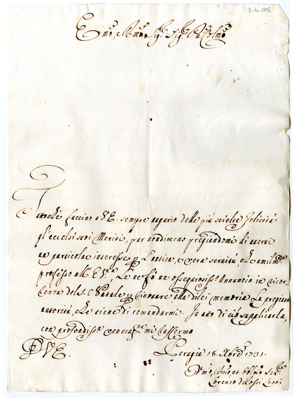Lettera di Lorenzo Rossi Leoni al cardinale Annibale Albani (1731 dicembre 18)