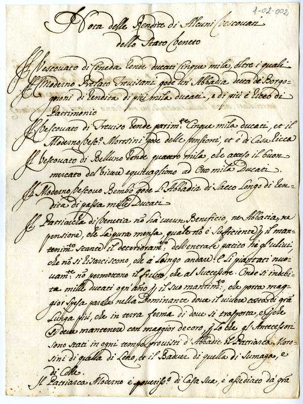 Note delle rendite dei vescovati di Ceneda, Treviso, Belluno, Venezia