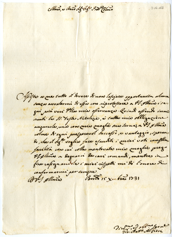 Lettera di Giovanni Battista Alfieri al cardinale Annibale Albani (1731 dicembre 15)