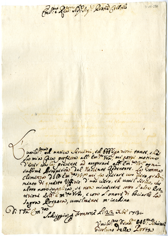 Lettera di Girolamo della Porta al cardinale Annibale Albani (1731 dicembre 22)