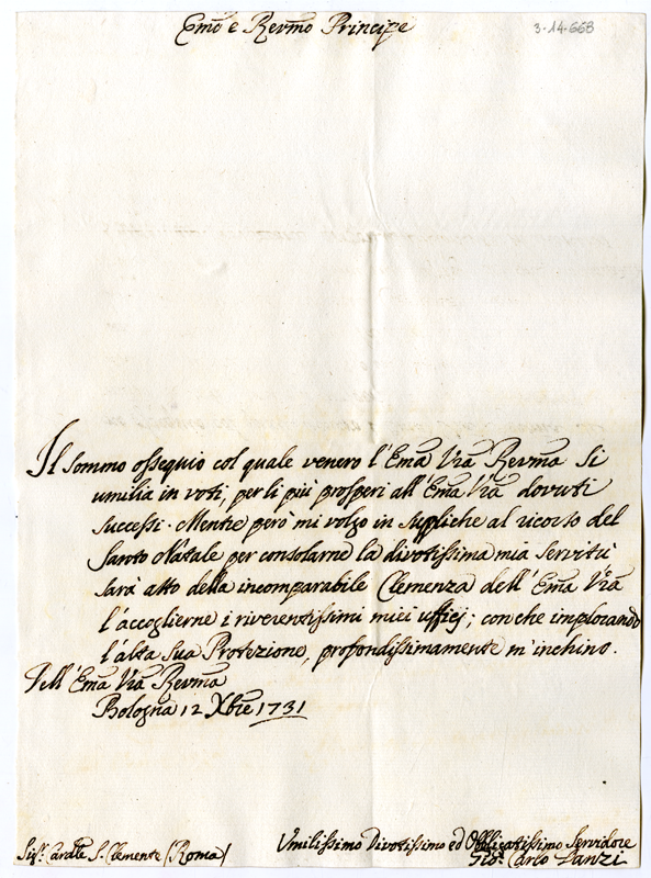 Lettera di Giovanni Carlo Lanzi al cardinale Annibale Albani (1731 dicembre 12)