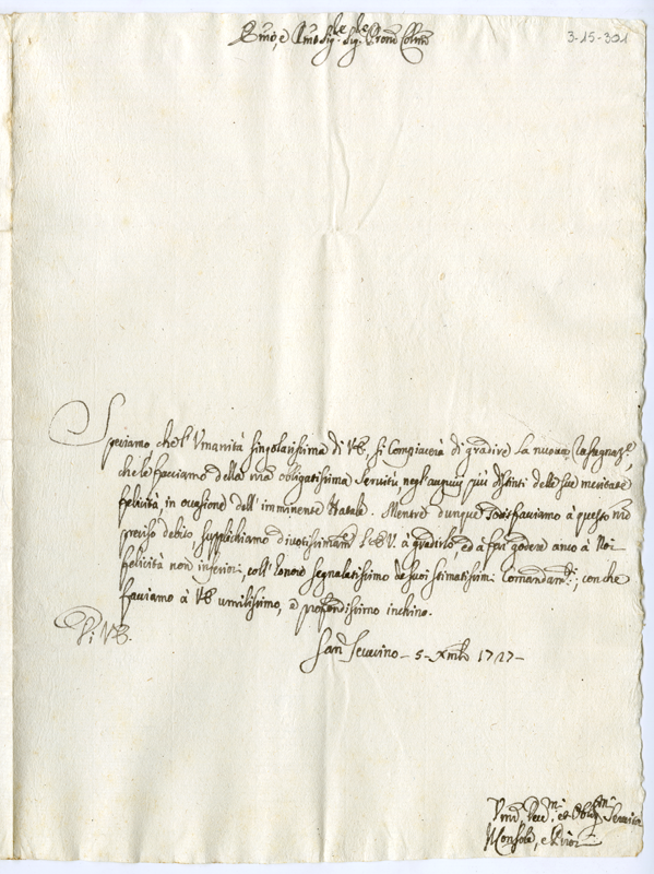 Lettera del gonfaloniere e priori di San Severino al cardinale Annibale Albani (1727 dicembre 5)