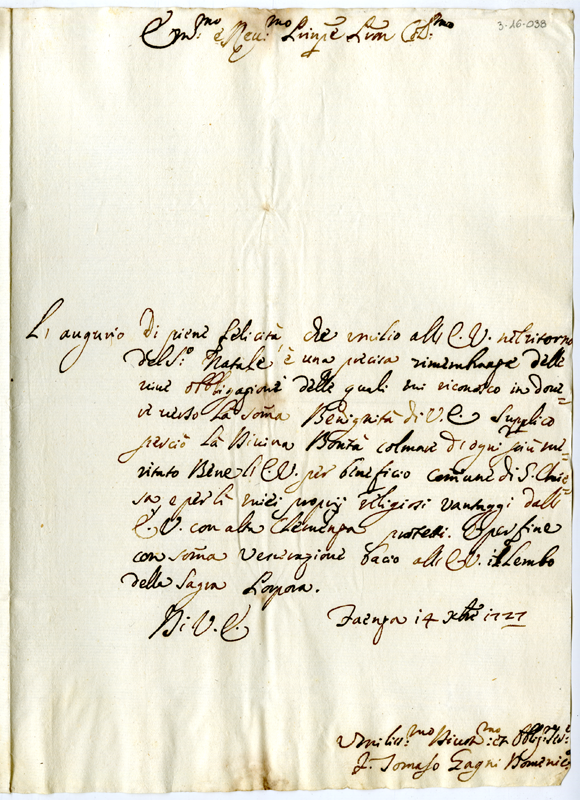 Lettera di fra Tommaso Gagni domenicano al cardinale Annibale Albani (1727 dicembre 14)