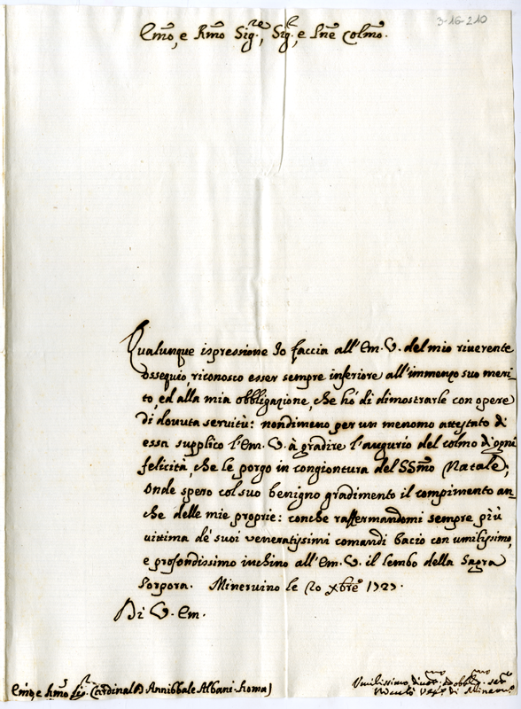 Lettera di Niccolò vescovo di Minervino al cardinale Annibale Albani (1727 dicembre 20)