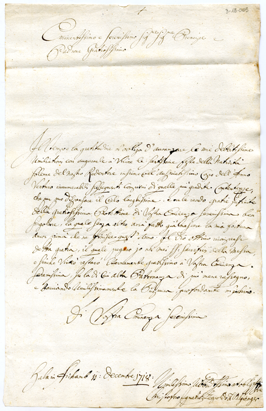 Lettera di Cristoforo Ignazio Leopoldo barone di Gienger ad Annibale Albani (1718 dicembre 11)