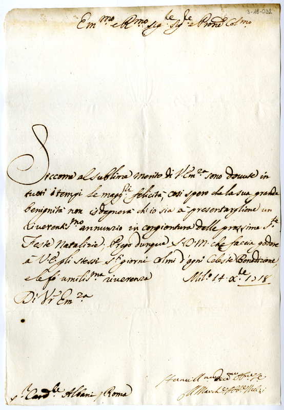 Lettera del marchese abbate Melzi al cardinale Annibale Albani (1718 dicembre 14)