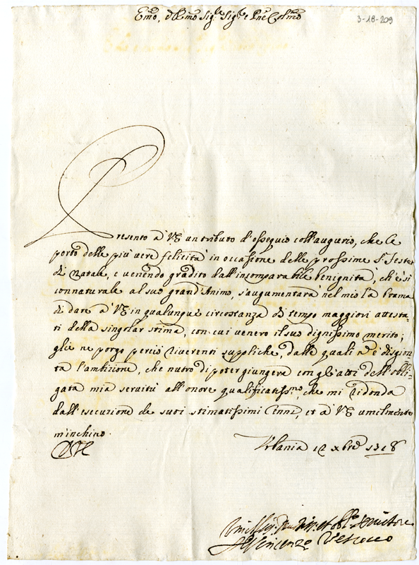Lettera di Vincenzo vescovo ad Annibale Albani (1718 dicembre 12)