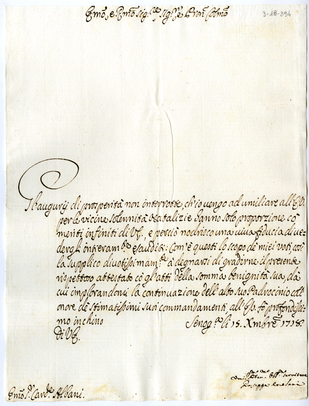Lettera di Giuseppe Ercolani al cardinale Annibale Albani (1718 dicembre 15)